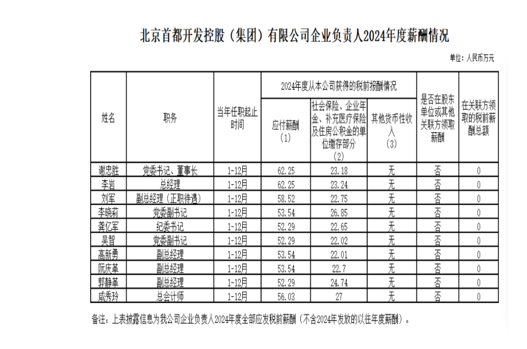 2024年度首开集团企业负责人薪酬信息公示